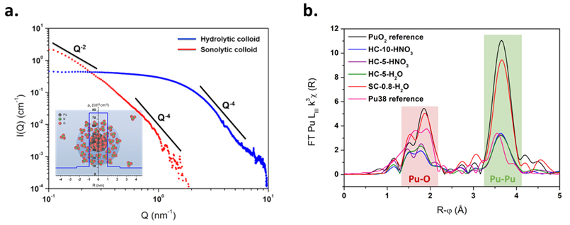 Les différentes caractérisations permettent de décrire les colloïdes obtenues par hydrolyse comme des nanoparticules cœur-coquille constituées d’un cœur oxyde (PuO2) et recouvertes d’une coquille de Pu(IV) hydrolysé, combinée à des ions nitrate. La sonolyse conduit quant à elle à la formation de structures de 5,7 nm d’épaisseur et de longueur supérieure à 30 nm (Diagrammes SAXS présentés Figure 1a.).