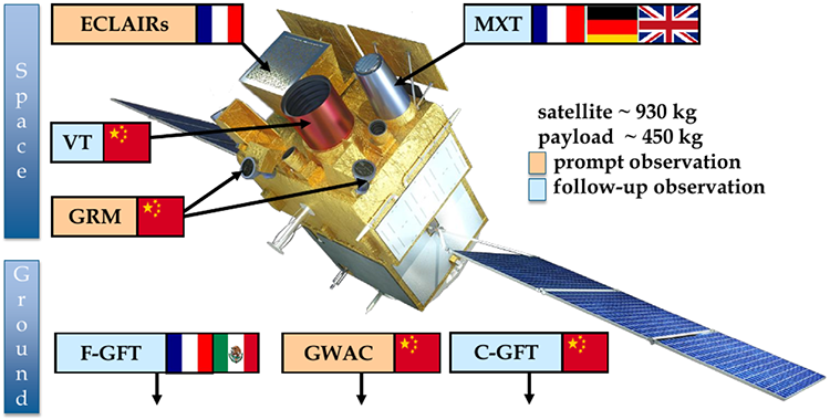 Figure 1 : Schéma du SVOM indiquant les quatre instruments embarqués pour la mission