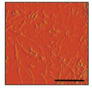 Image par microscopie à force atomique (AFM) de fibrilles β-amyloïdes. La barre d’échelle correspond à 200 nm.