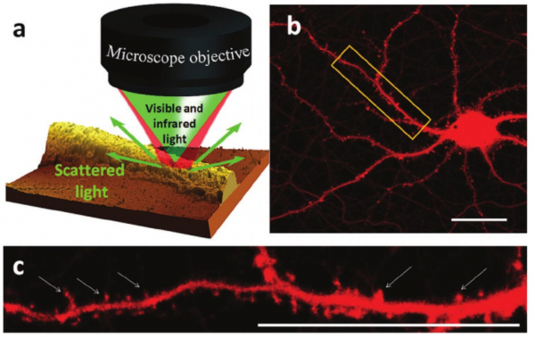 c) zoom sur la région marquée dans un cadre jaune en b. Les flèches blanches marquent les épines dendritiques le long d’une neurite du neurone.