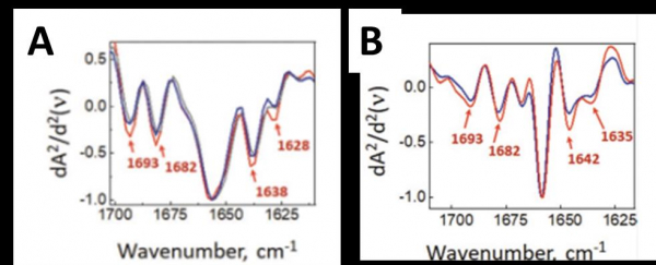 A) Spectres µIRTF synchrotron des agrégats amyloïdes (rouge) et d’un amas de neurones contrôle (bleu).