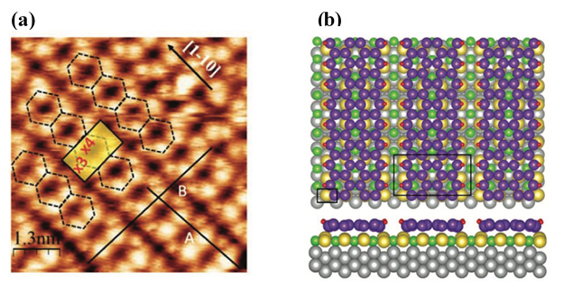 (a) Image de STM présentant des nanorubans de silicium en forme de nid d'abeille.