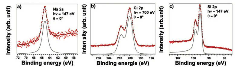 Des expériences de spectroscopie de photoélectrons des rayons X (XPS) à haute résolution ont été réalisées sur la ligne TEMPO. Des spectres des niveaux de cœur de Cl 2p et Na 2s ont été mesurés après dépôt de Si sur NaCl/Ag(110). Les spectres des niveaux de cœur du Cl et du Na sont composés d’un seul doublet de pics séparés par le couplage spin-orbite (Figure 2). Cela signifie que les ions Na et Cl n’ont qu’un seul environnement chimique (Na entouré d’atomes de Cl, et Cl entouré d’atomes de Na). Ceci constitue une première preuve de l'interaction faible entre la couche de NaCl et le Si, ainsi qu'entre la couche de NaCl et le substrat d'argent. De même, le spectre Si 2p ne présente qu’une seule composante de couplage spin-orbite, ce qui indique que les atomes de silicium sont tous équivalents en n’ayant qu’un seul environnement chimique. Ainsi, les atomes de Si sont adsorbés sur la couche de NaCl et l'interaction Si-NaCl est faible.