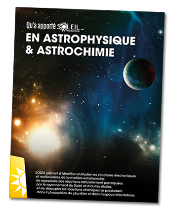 Après plus de 10 ans d'ouverture à nos utilisateurs et utilisatrices, SOLEIL dresse un bilan des résultats importants obtenus grâce aux lignes de lumière pendant cette période d'exploitation. Pour ce faire, nous vous invitons à découvrir une série de brochures thématiques qui présente les contributions scientifiques majeures du Synchrotron SOLEIL à différents enjeux de société. Faisant suite aux Diagnostics et Pronostics Médicaux, au domaine de l'agroalimentaire, et aux Matériaux quantiques, le 4ème numéro de cette série vous fait découvrir les apports de SOLEIL en astrophysique et astrochimie.