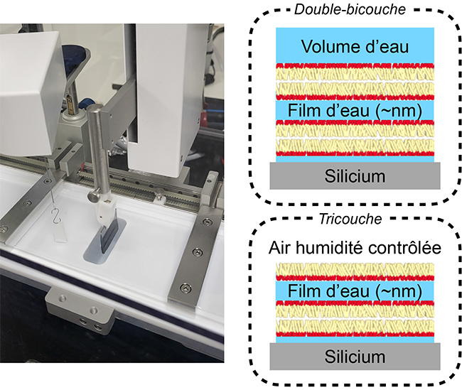 Depuis trente ans, plusieurs modèles de couplage fort ont été développés, mais les systèmes expérimentaux simples et bien contrôlés permettant de les tester restent rares. Les couches de lipides supportées constituent un tel système modèle. En empilant des monocouches de lipides une par une sur une surface de silicium, on peut créer un « sandwich » où une couche d’eau de l’ordre du nanomètre est confinée entre deux membranes, dont la composition et la charge sont maîtrisées.