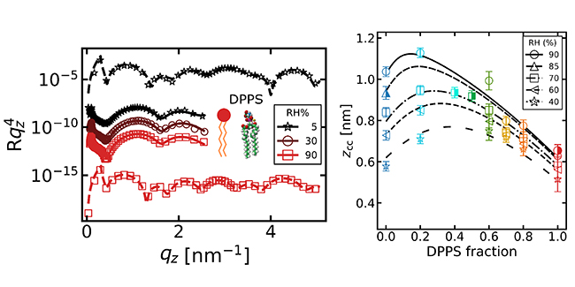 Figure 2 : À gauche, les mesures de réflectivité de rayons X et de neutrons révèlent la structure des tricouches, en particulier l’évolution de l’épaisseur d’eau nanométrique séparant les couches avec l’humidité relative. À droite, la comparaison entre ces épaisseurs et les prédictions théoriques, pour différentes charges de surface (fraction de DPPS, le lipide chargé) et humidités relatives (RH), montre un excellent accord et confirme la validité des modèles théoriques de couplage fort.