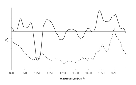 Spectre différentiel (─) obtenu en soustrayant du spectre ATR-FTIR associé à la solution complexe à pH=4 celui du peptide déprotoné pur (---)