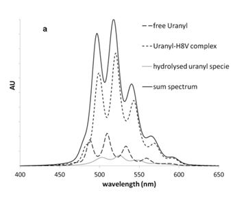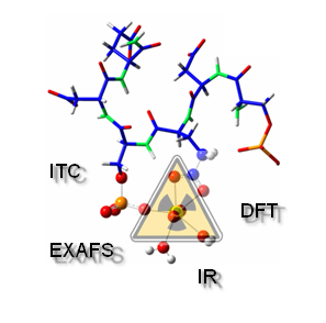 La procédure d'ajustement EXAFS a indiqué que l'uranium était lié à un groupe fonctionnel phosphoryle et à un groupe fonctionnel carboxyle de la molécule de peptide, avec une distance moyenne de 2,90 Å entre l'atome d'uranium et celui de carbone, et de 3,87 Å entre l'atome d'uranium et celui de phosphore. Ces distances sont caractéristiques d'un complexe de sphère interne avec un atome d'oxygène partagé par l'uranium et le groupe phosphoryle, et deux atomes d'oxygène provenant d'un unique groupe carboxyle (mode de coordination bidentate). La sphère de coordination était complétée par deux molécules d'eau.
