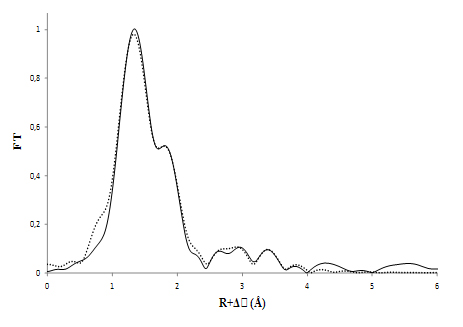 L'ajustement associé des données EXAFS après transformée de Fourier. La courbe en trait continu noir représente les données expérimentales et la courbe en pointillés représente l'ajustement associé.
