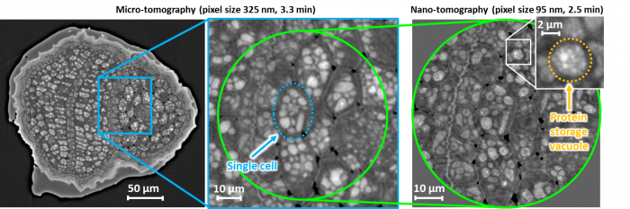 Basée sur un microscope X plein champ à transmission (Transmission X-ray microscope, TXM), elle permet d’obtenir une résolution spatiale en 3D de l’ordre de 100 nm et en deçà. En complément des analyses en microtomographie X à faisceau parallèle donnant accès à des échelles de longueur d’environ 500 nm et plus, il est désormais possible d’explorer des structures complexes biologiques, ou des systèmes matériaux, en trois dimensions et à différentes résolutions jusqu’à 20 nm (taille du pixel). Les graines d’Arabidopsis thaliana étudiées par l’équipe de l’INRA ont un diamètre d’environ 0.3 mm et ont été mesurées sans découpage. Le temps d’acquisition pour un volume était de 2,5 minutes. La figure b montre des coupes virtuelles extraites d’images volumiques tridimensionnelles obtenues en tomographie à différentes échelles de longueur allant jusqu’à la graine complète.