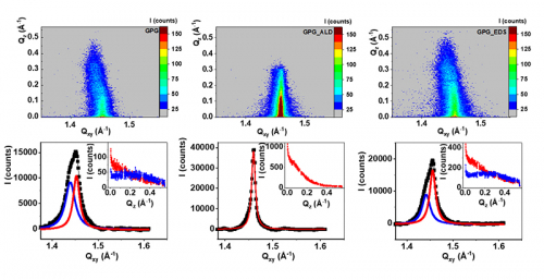 Figure 2 : Sélection de résultats de diffraction de rayons X en incidence rasante. Ligne du haut : cartes d'intensité I(Qxy,Qz). Ligne du bas : spectres intégres en Qz I(Qxy) et coupes à Qxy constant I(Qz) (tiges de Bragg) obtenus à partir des cartes d'intensité ci-dessus.