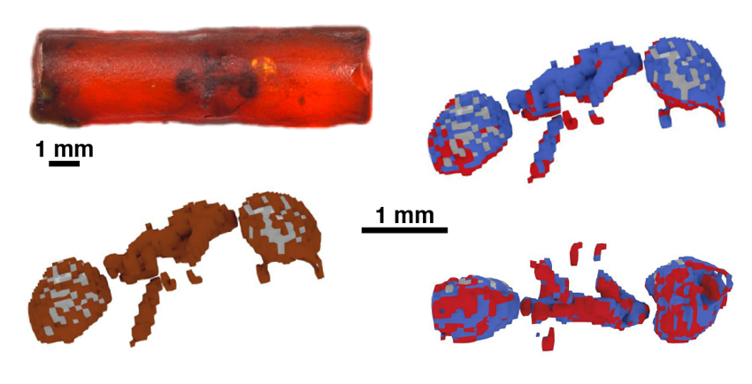 Figure 1 : Imagerie Raman de rayons X 3D d’une fourmi piégée dans l’ambre il y a 53 millions d’années. La chimie du carbone révèle des traces de chitine, mieux préservées sur la surface de la fourmi ayant été en premier en contact avec la résine.