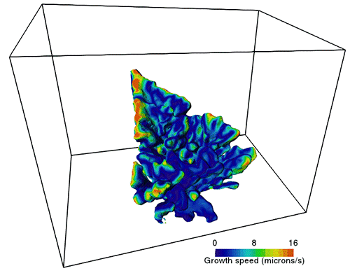 Fig. 2a : représentation de la vitesse locale déterminée à partir de maillages surfaciques 3D de l’interface solide-liquide au cours de la solidification (distance euclidienne locale entre les surfaces calculée et divisée par le temps entre les scans).
