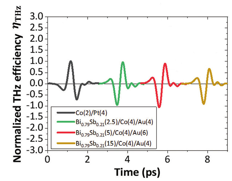 Ainsi, une émission THz intense a bien été observée sur les couches d’alliage BiSb, et ce avec une intensité du signal équivalente à celle mesurée sur du Platine, le matériau connu comme étant le plus efficace pour la conversion spin/charge (figure 2) ! De plus, cette intensité ne varie quasiment pas avec l’épaisseur des films, ce qui tend à montrer que ce sont bien les états de surface (et non le volume du film) qui sont à l’origine de la conversion.