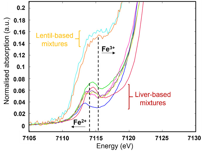 Dans un second temps, la spectroscopie XANES a permis d’identifier et de différencier les formes de fer propres aux matrices animales et végétales. Les résultats ont montré des formes de fer plus réduites pour les matrices à base de foie et des formes plus oxydées pour celles contenant des lentilles (Figure 3). Après quelques jours de conservation, la spectroscopie µ-XANES a révélé des interactions entre les parties animales et végétales dans l’aliment mixte, avec la présence de formes de fer réduites proches de celles du foie dans la partie végétale. Deux hypothèses ont alors été formulées : un phénomène de diffusion du fer d’origine animale vers la partie végétale ou un changement dans la spéciation du fer d’origine végétale vers une forme plus réduite, ce qui pourrait expliquer une meilleure assimilation ensuite par l’organisme.