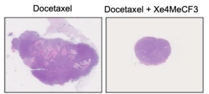 Figure 2 : Images de xénogreffes homme/souris. Tumeurs issues d’un patient atteint d’un cancer résistant à la castration et au docétaxel, greffées sur des souris traitées soit par docétaxel seul (gauche), soit par la combinaison docétaxel + Xe4MeCF3 (droite). Échelle = 5 mm.