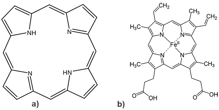 b – exemple de métalloporphyrine : l’hème b, qui entre dans la composition de l’hémoglobine. L’hème b accueille un atome de Fe, sous forme ferreux Fe2+ au centre de la structure, qui permet à l’hème de fixer le dioxygène O2 et de transporter l'oxygène dans le sang.