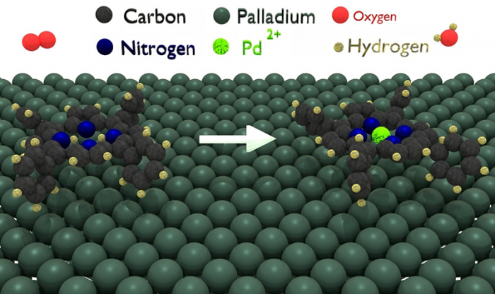 Il est ainsi apparu que l'auto-métallation peut être induite par l'oxygène en phase gazeuse dès la température ambiante. La barrière énergétique mesurée est seulement de 0,37-0,4 eV. Les atomes d'hydrogène pyrroliques réagissent grâce à la médiation d'un atome de Pd de la surface jouant le rôle de catalyseur, pour former de l'hydrogène moléculaire (figure 3). Les mêmes atomes d'hydrogène pyrrolique au centre de la molécule peuvent être transférés à un atome d'oxygène, toujours avec la médiation catalytique d’un atome de Pd, ce qui produit alors de l'eau. Une autre voie fait intervenir la surface de Pd(100), qui accueille les atomes d'hydrogène après la métallation et avant la désorption de la métalloporphyrine.