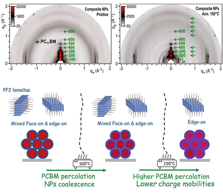 Figure 3 : Diffractogrammes GIWAXS d'un film NP composite (PF2:PC71BM), tel que préparé et après recuit à 150°C, et représentation schématique des changements morphologiques au cours du recuit.