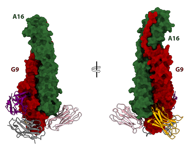 Figure 1 : Structure, obtenue par cryomicroscopie électronique, de A16/G9 (en rouge et vert) en complexe avec un régulateur de fusion viral (en jaune et orange).