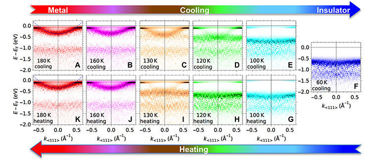 Quand la température baisse entre 180K et 100K, l’intensité de la bande parabolique baisse petit à petit, pendant qu’une bande très horizontale, typique d’électrons restant localisés sur les sites atomiques, devient de plus en plus intense, signe que des électrons mobiles « transmutent » en électrons localisés. De plus, cette bande horizontale bouge petit à petit vers des énergies de liaison plus grandes. La tendance s’inverse en réchauffant, mais avec un décalage en température (comparer les images à 120K et 130K en refroidissant et réchauffant), ce qui peut s’expliquer par la formation, à températures intermédiaires, d’îlots métalliques et isolants dont la proportion dépend de l’état précédent du matériau.
