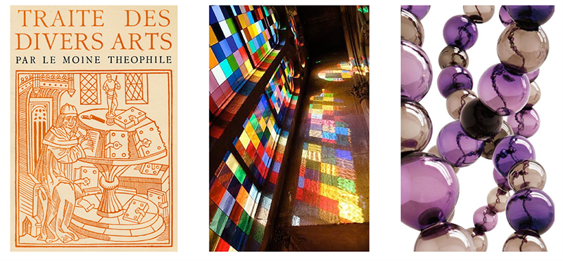 (à gauche) Frontispice d’une édition de la Schedula du moine Théophile ; (milieu) vitrail de la cathédrale de Cologne par G. Richter, 2007 ;