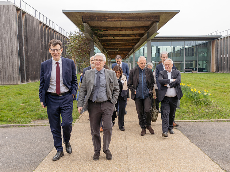 Au premier plan Philippe BAPTISTE, Ministre chargé de l’Enseignement supérieur et de la Recherche, accompagné de Jean SUSINI, directeur général de SOLEIL. Au second plan, Amor NADJI et Amina TALEB (Synchrotron SOLEIL) Antoine PETIT, Président-directeur général du CNRS et Benoit Forêt (CNRS). Au troisième plan, François JACQ, Administrateur général du CEA, Stéphanie HUSTACHE (Synchrotron SOLEIL) et Thierry DAUXOIS (CNRS).
