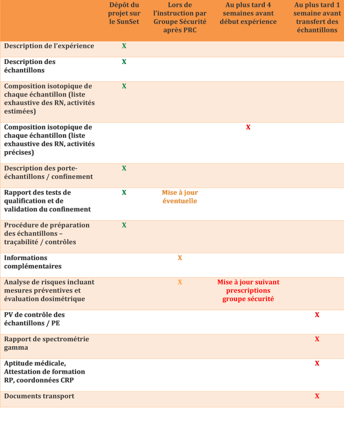 Enfin, pour que le projet déposé puisse être autorisé par le groupe sécurité de SOLEIL, il est indispensable que le responsable du projet s’assure de la fourniture des documents et informations attendues par la Section de Radioprotection (SRP) en temps et en heure (Cf. Tableau 2 en fin de consigne) dans le respect des prescriptions de l’Autorité de Sûreté Nucléaire applicables à SOLEIL.