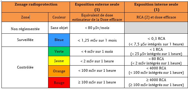 - Si les risques d’exposition externe et interne coexistent, on doit procéder à la somme des doses efficaces. Les mêmes critères que ceux indiqués dans le tableau sont alors utilisés pour déterminer le zonage du local concerné.