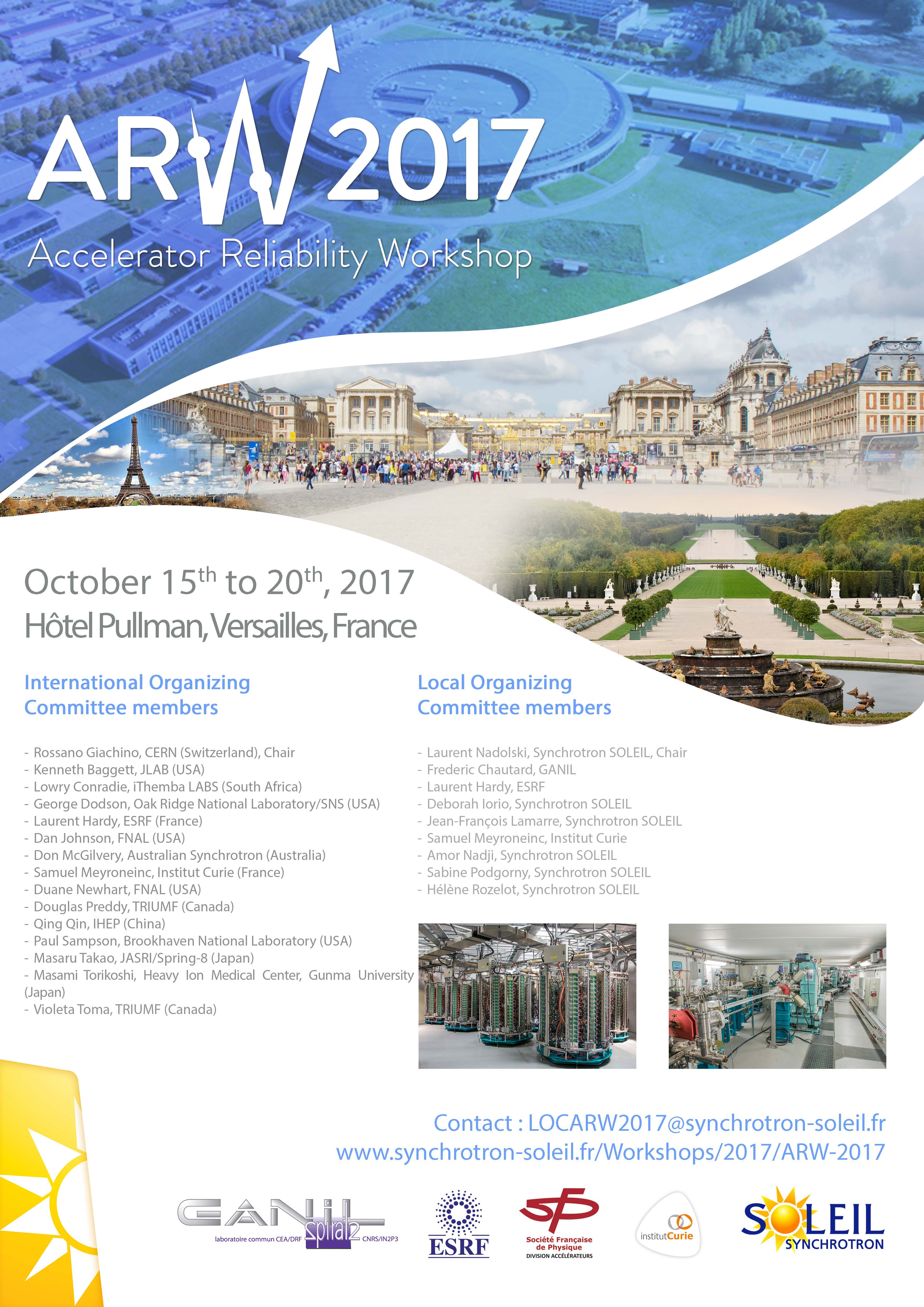 We are pleased to announce the 6th Accelerator Reliability Workshop, ARW 2017, which will take place in Versailles, France, from October 15 to October 20, 2017. ARW 2017 is hosted by Synchrotron SOLEIL and supported by ESRF, GANIL, Institut Curie and the French Physics Society. It follows in the tradition of successful workshops started by the ESRF (Grenoble 2002), TRIUMF (Vancouver 2009), iThemba (Cape Town 2011), the Australian Synchrotron (Melbourne 2013) and SNS (Knoxville 2015).