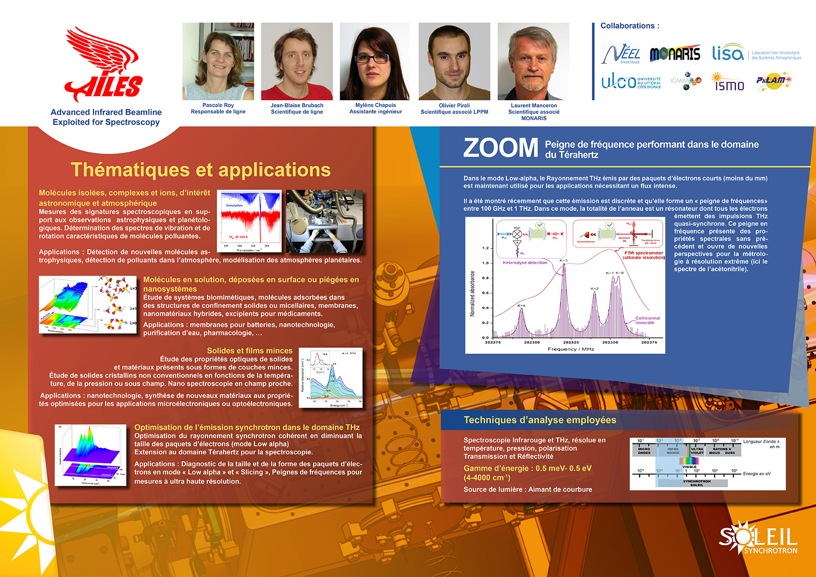 AILES Synchrotron SOLEILCes deux stations spectroscopiques sont consacrées respectivement aux études optiques de matériaux condensés (AILES B)  et aux études ro-vibrationelles de systèmes moléculaires (AILES A). Cette dernière est la station expérimentale de SOLEIL ayant la plus haute résolution spectrale absolue : 0.1 micro eV.