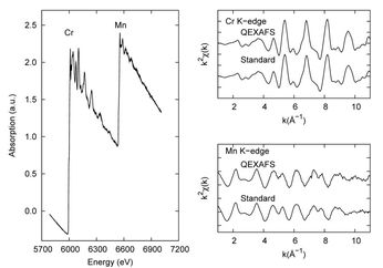 (left) Absorption of stacked Cr and Mn metallic foils measured over an amplitude of 3.6 °. Data are the average of 10 spectra each collected at 1Hz. (right) k2 weighted Quick-EXAFS are compared to standard scans taken in almost 15 min.